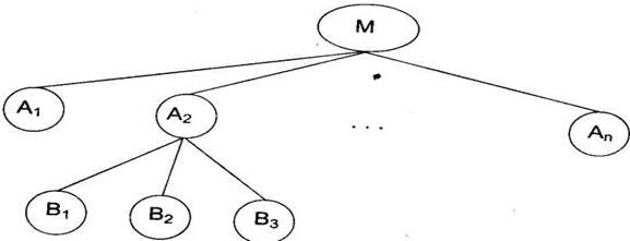 В наиболее общем виде корпоративную группу можно представить как объединение одной материнской и нескольких дочерних компаний, однако в реальной жизни отношения «материнская компания — дочерняя компания» могут быть многоуровневыми и схематично представляют собой опрокинутую древовидную структуру. На рис. 1.1 представлена ситуация когда материнская компания М имеет несколько дочерних компаний А1 . А2 , … , А n . В свою очередь компания А2 является материнской по отношению к компаниям В1 , В2 , В3 . [26, с. 55].