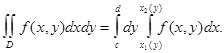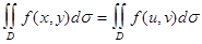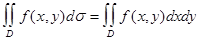 Двойной интеграл, разумеется, представляет собой число, зависящее только от подынтегральной функции и области интегрирования и вовсе не зависящее от обозначений переменных интегрирования, такчто, например,