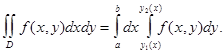 Пределы внутреннего интеграла переменные; они указывают границы изменения переменной интегрирования у при постоянном значении второго аргумента х. Пределы внешнего интеграла постоянны; они указывают границы, в которых может изменяться аргумент х.
